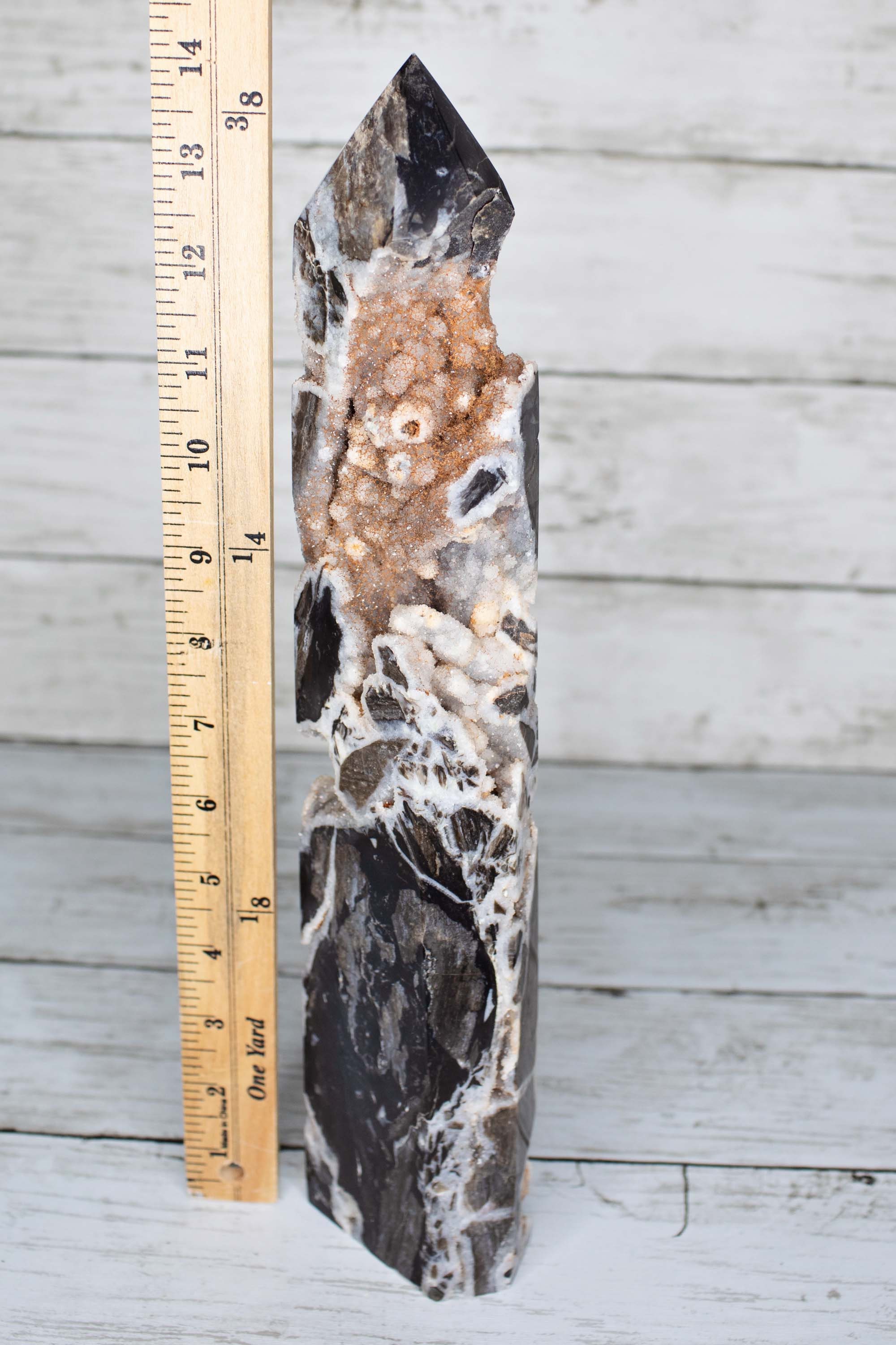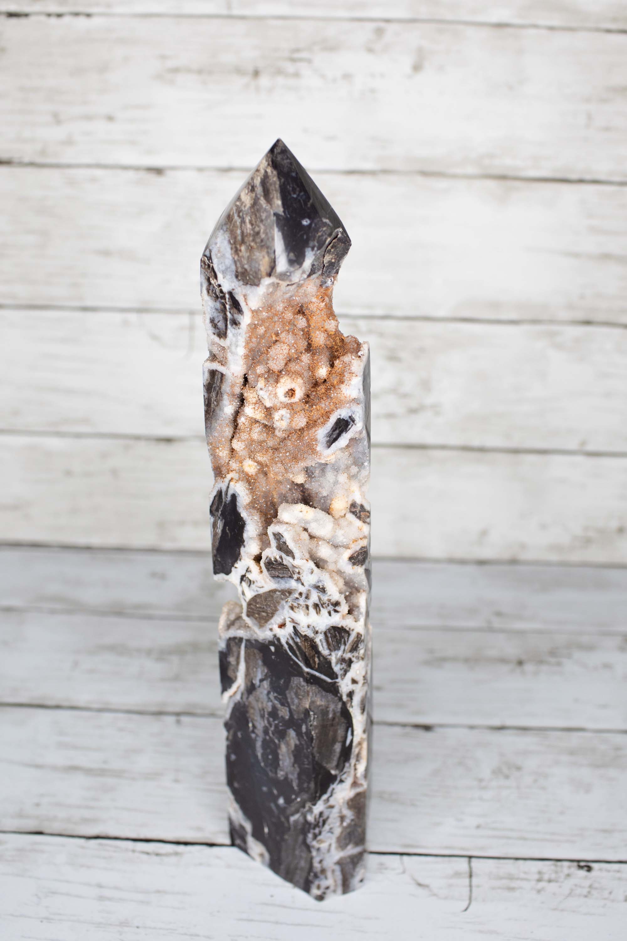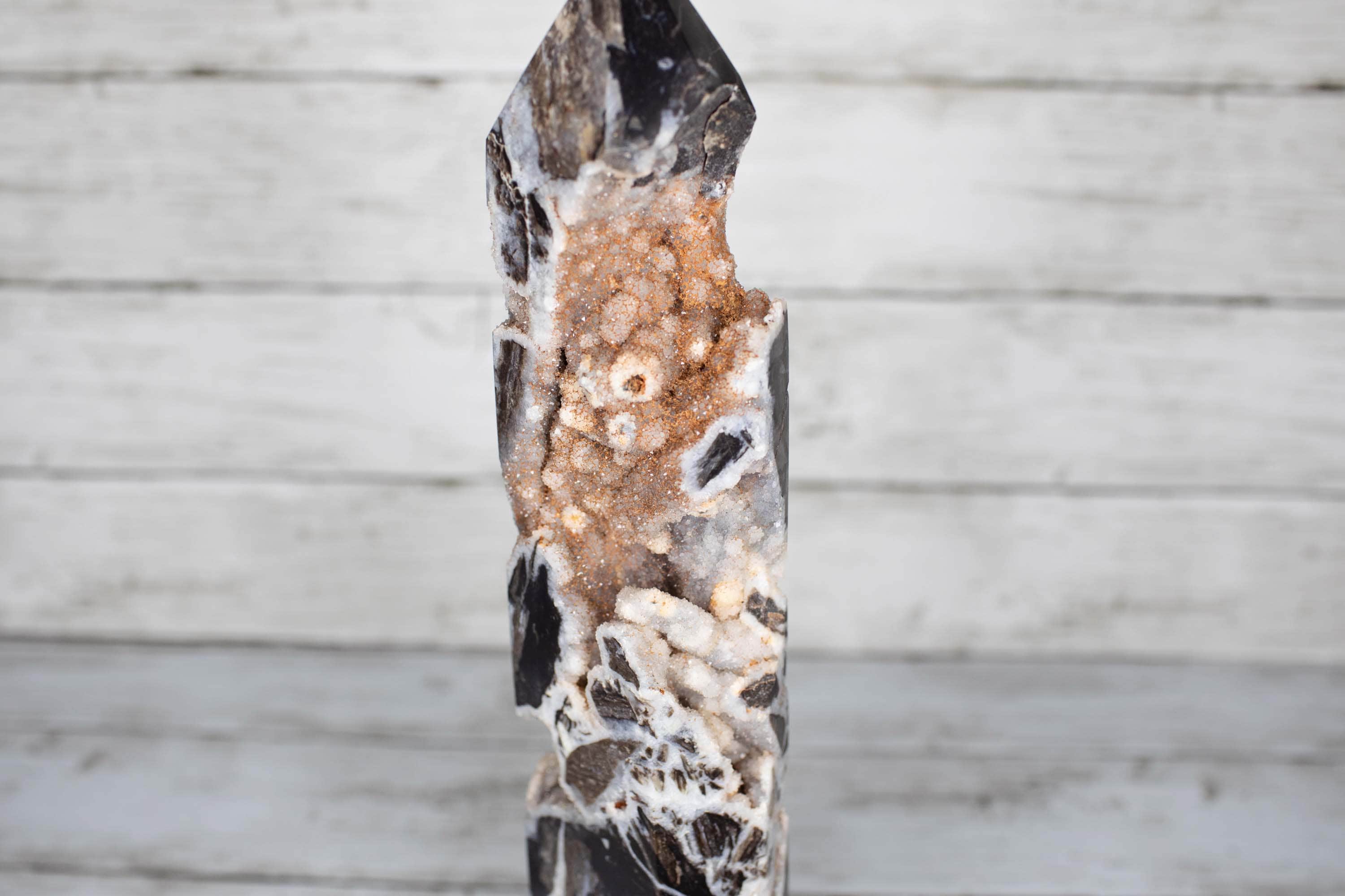 This beautiful hand carved Gray Sphalerite Druzy Tower is approximately 14 inches tall and 4 pounds heavy. It's tall!