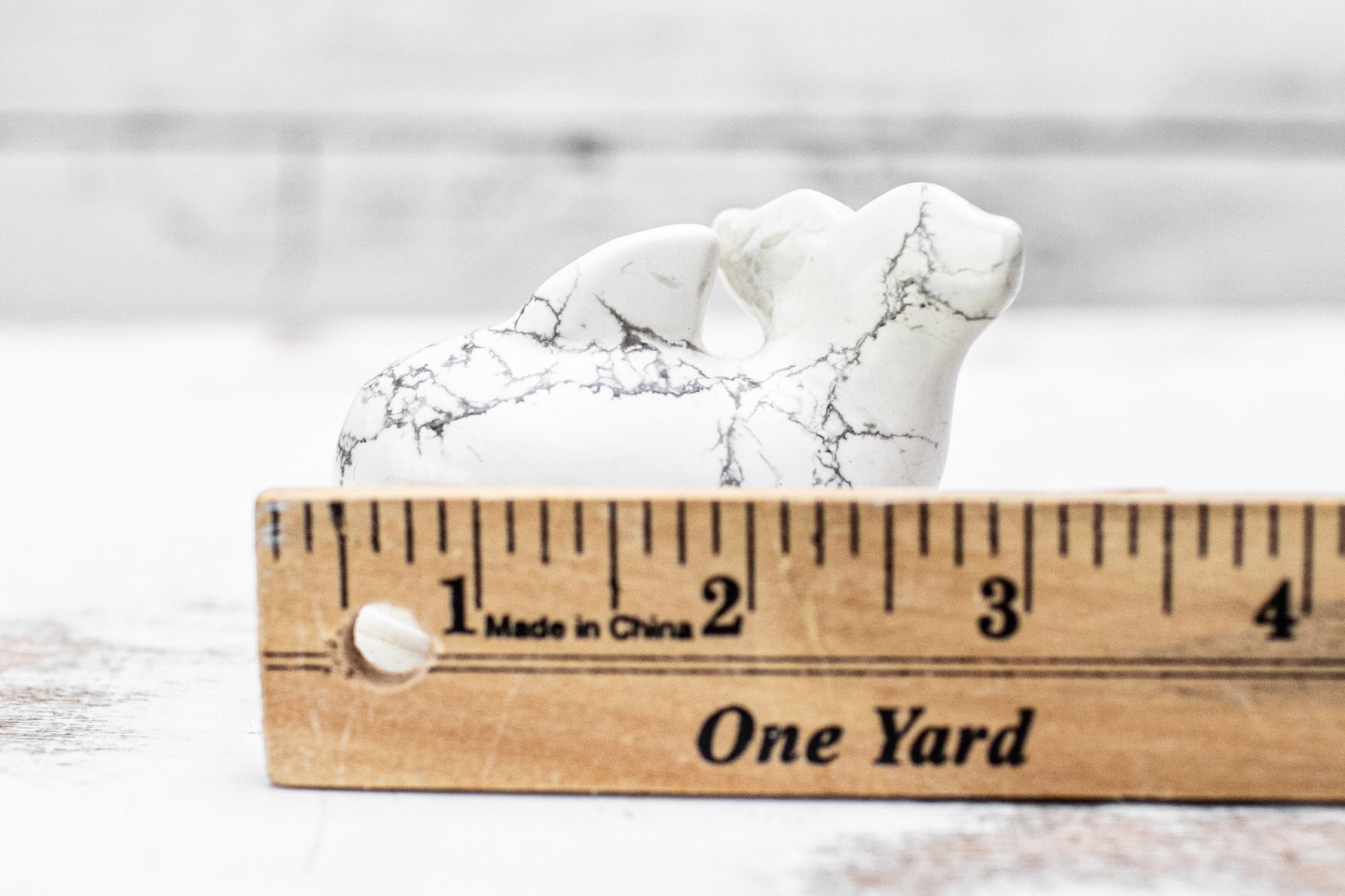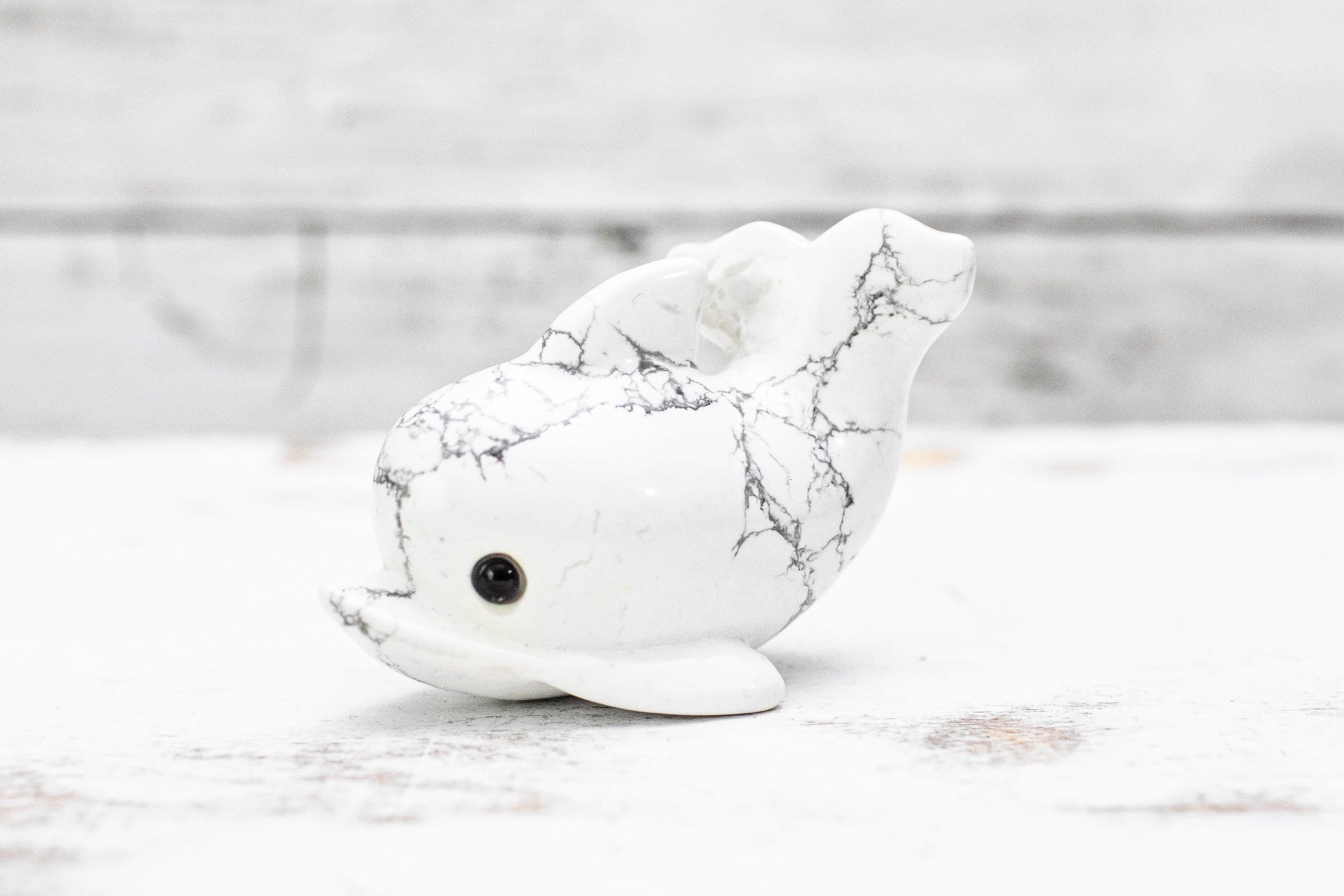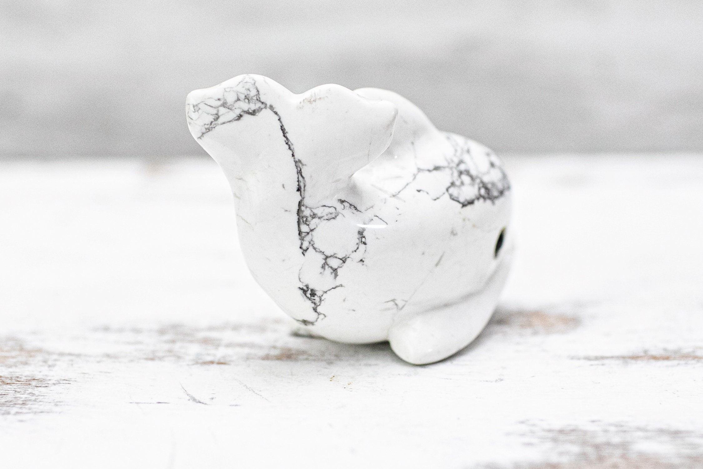 Cute little Howlite crystal carving approximately 3 inches long. It has natural cracks throughout its body. This is normal with carved natural crystals and what makes them unique. Please take a look at the photos for details.