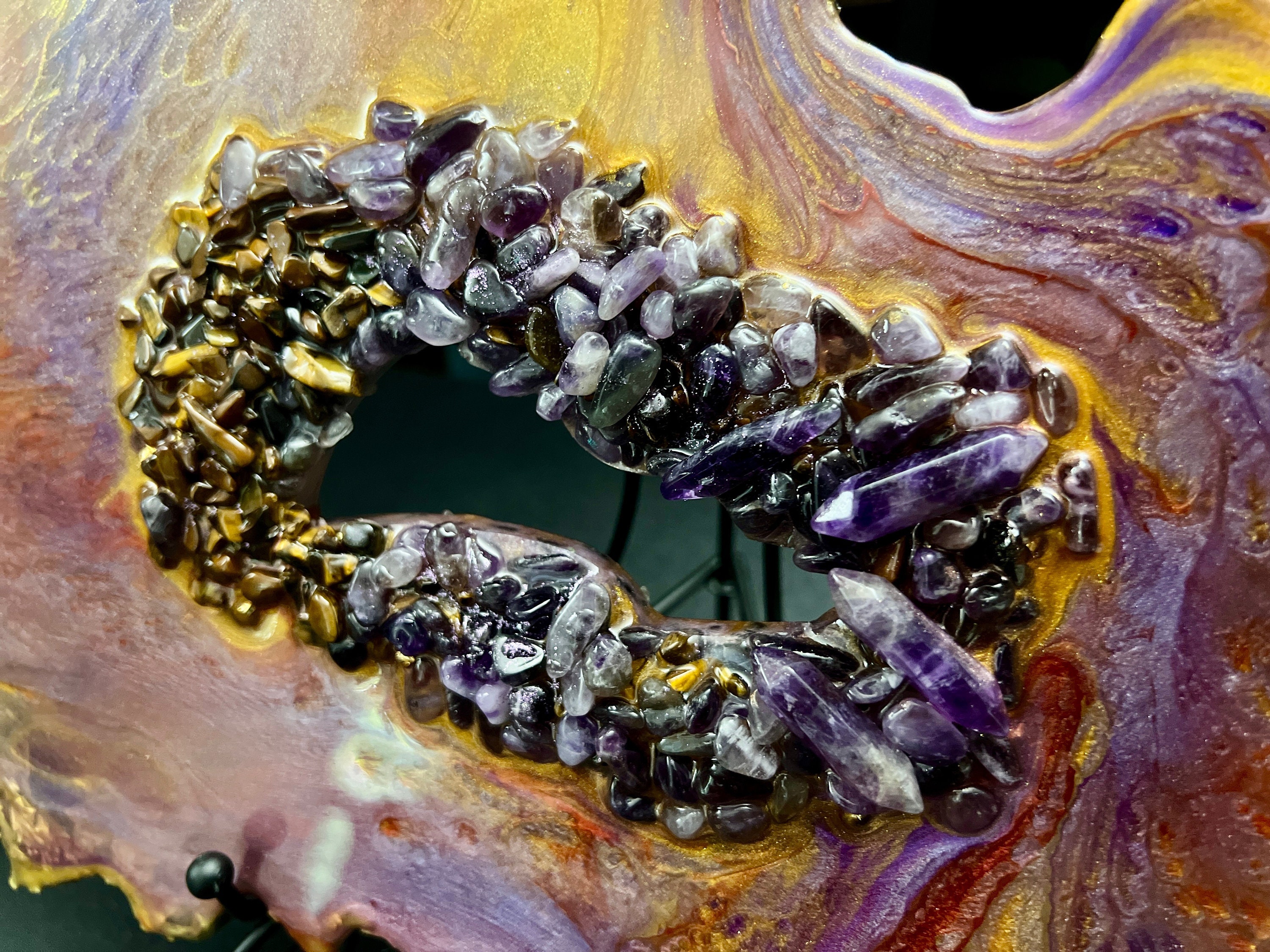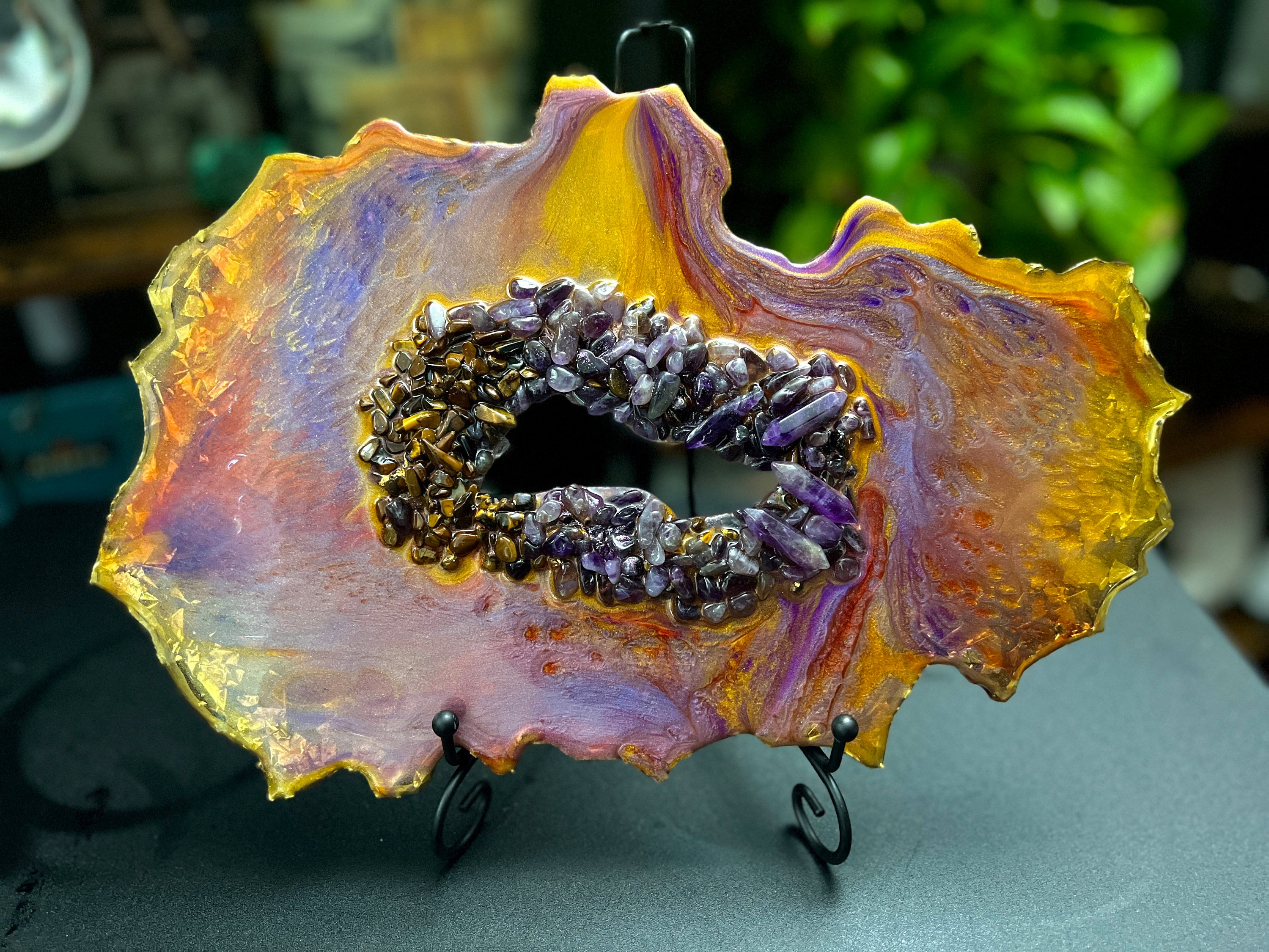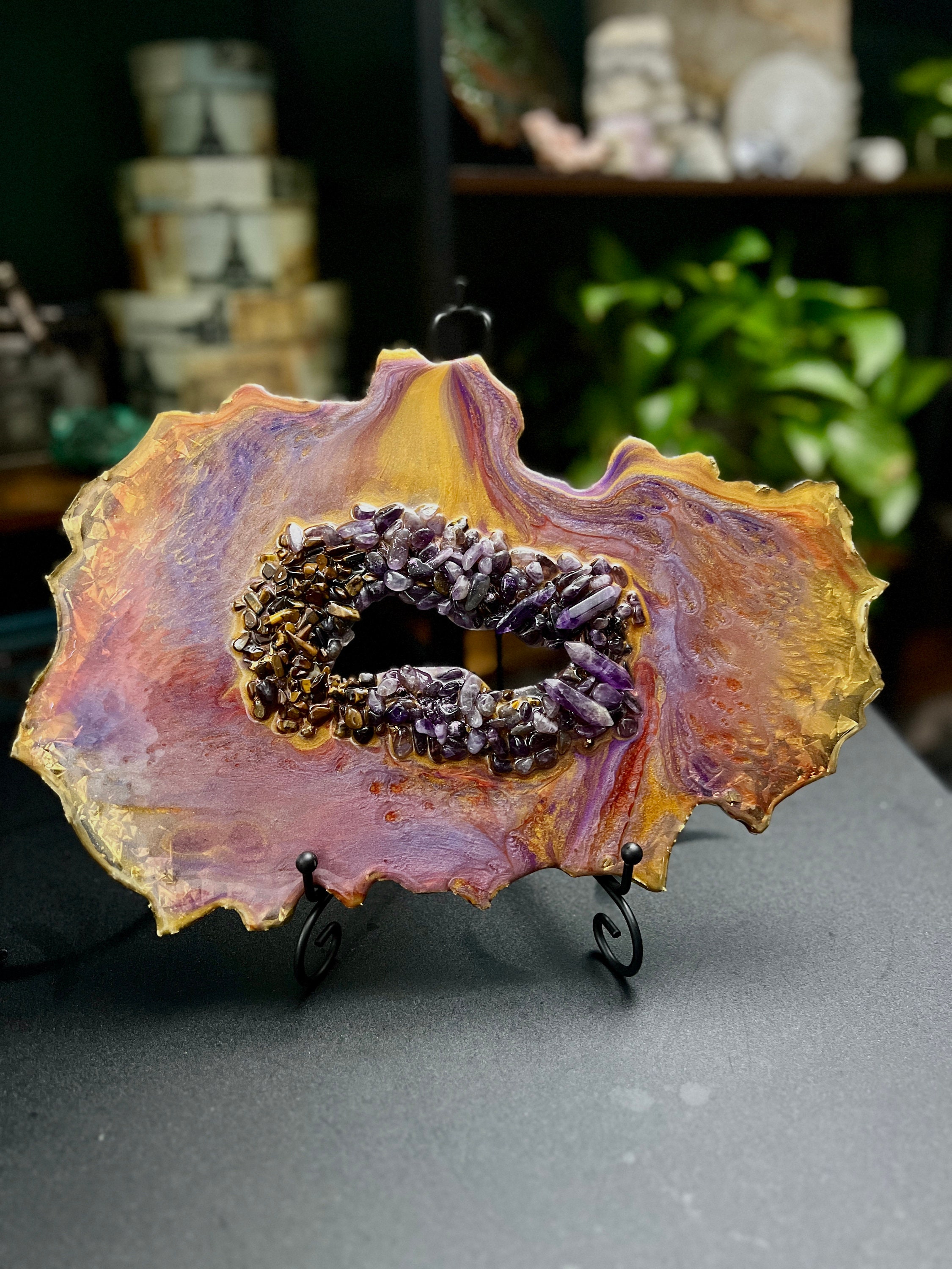 Beautiful geode sculpture made out of resin. The crystals in the center are REAL/NATURAL Amethyst and Tiger's Eyes crystals. Approximately 12 inches wide and 9 inches tall (sculpture alone without the stand). Price includes the stand. You are purchasing the same one you see in the photos and video.